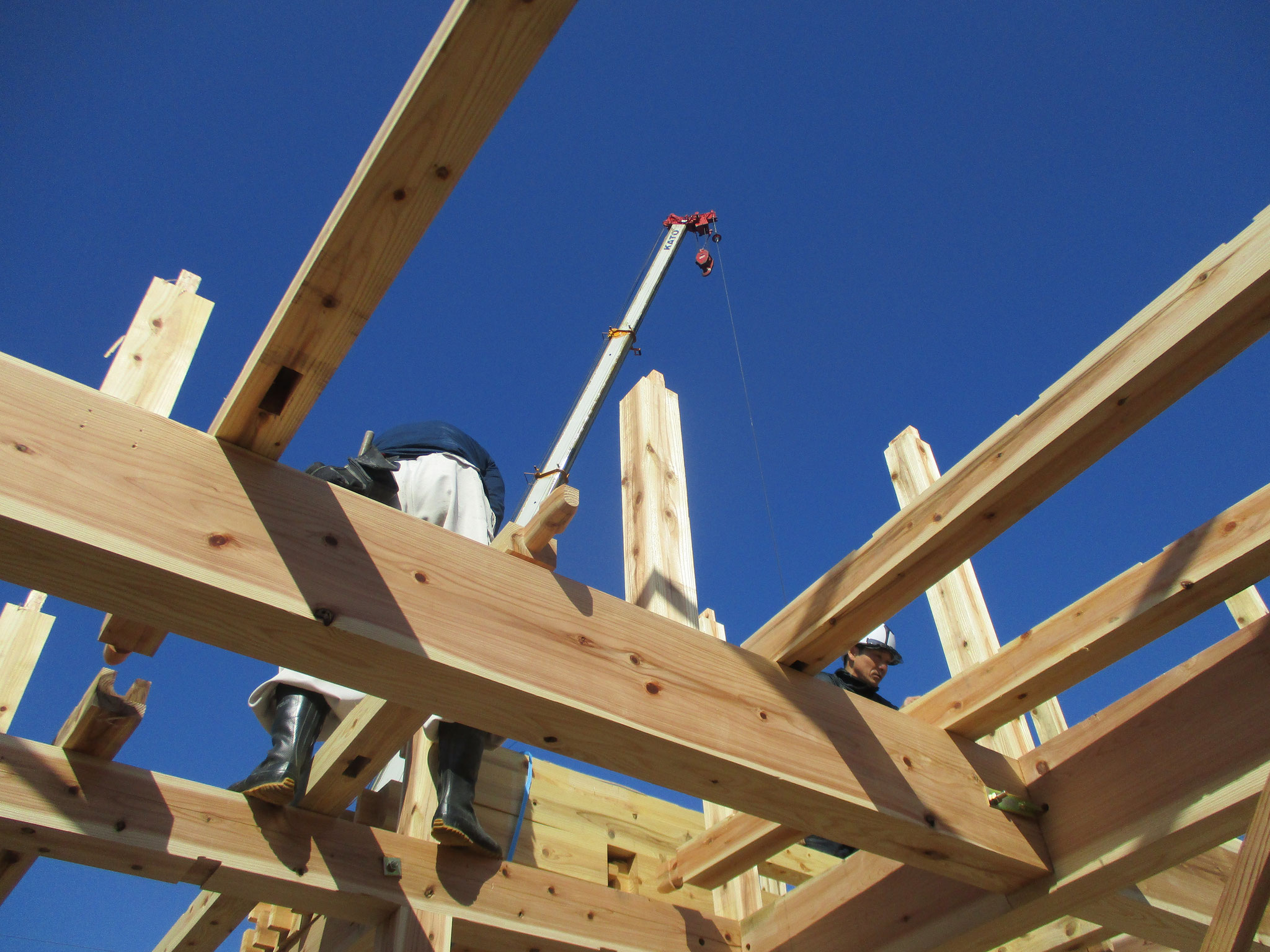 クレーンで木材を吊り、大工さんが組み立てて徐々に完成していきます。