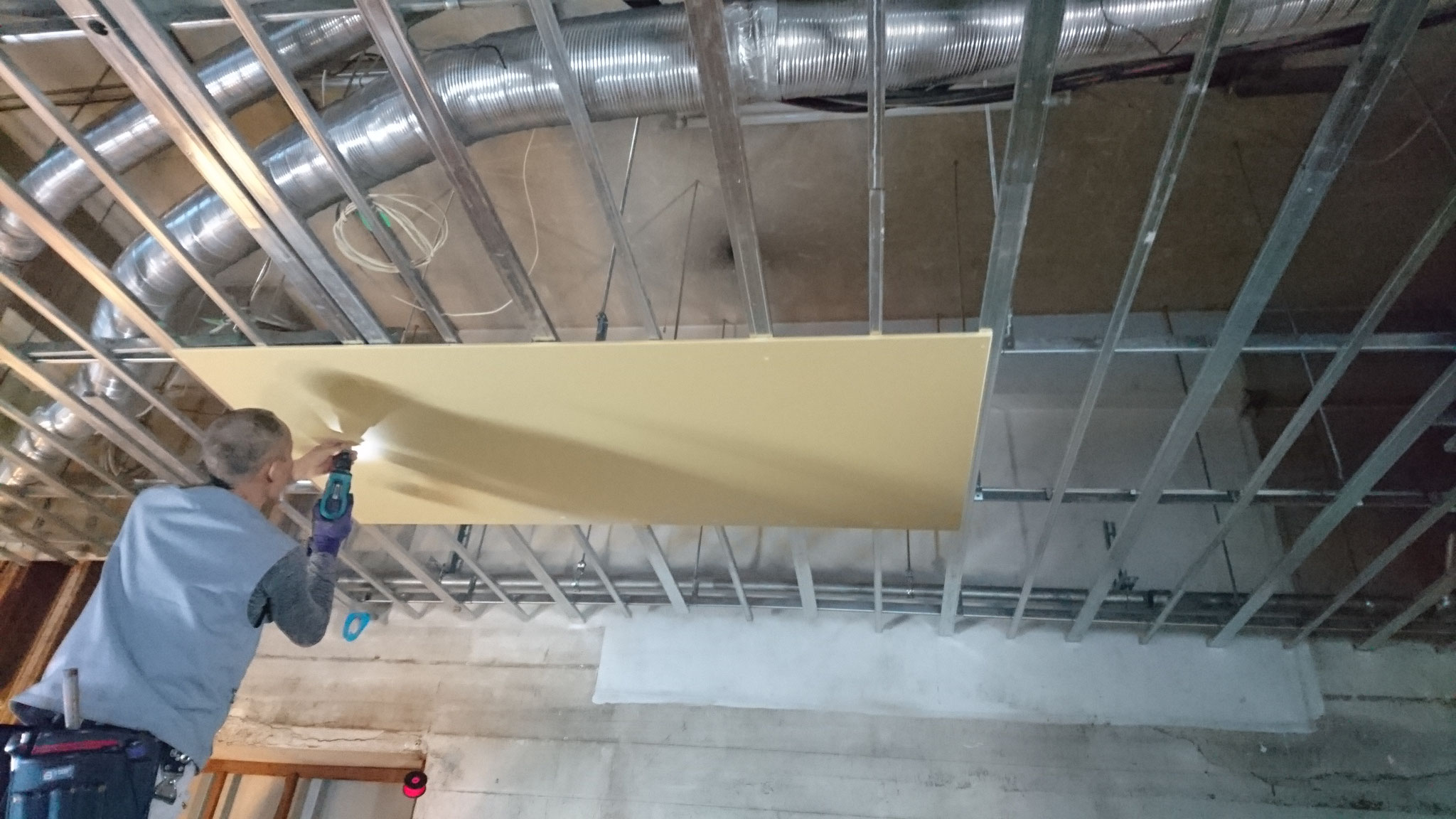 昼頃には天井の下地が完成し、天井を半分近く張り終えていました。