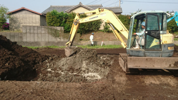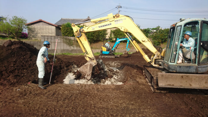 まず、敷地の表面(深さ2m程)をセメントと現地盤の土を混ぜて締め固める作業をします。