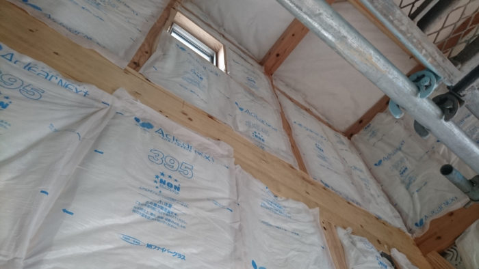 ただいま、断熱材を充填し、プラスターボードを貼っています。