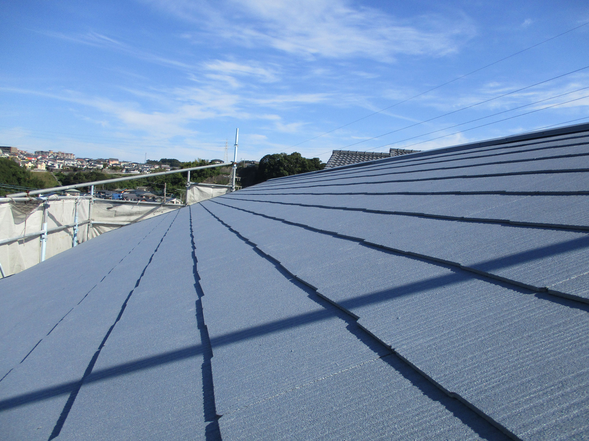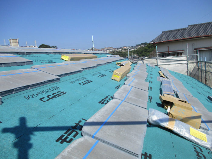 先週見に行った時、屋根の材料(コロニアル)が置かれていたのですが、週開けて見に行ってみると、コロニアルを張り終えていました!