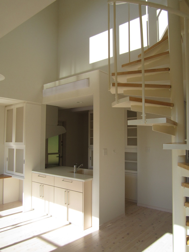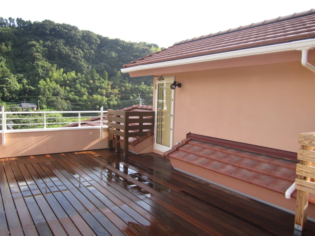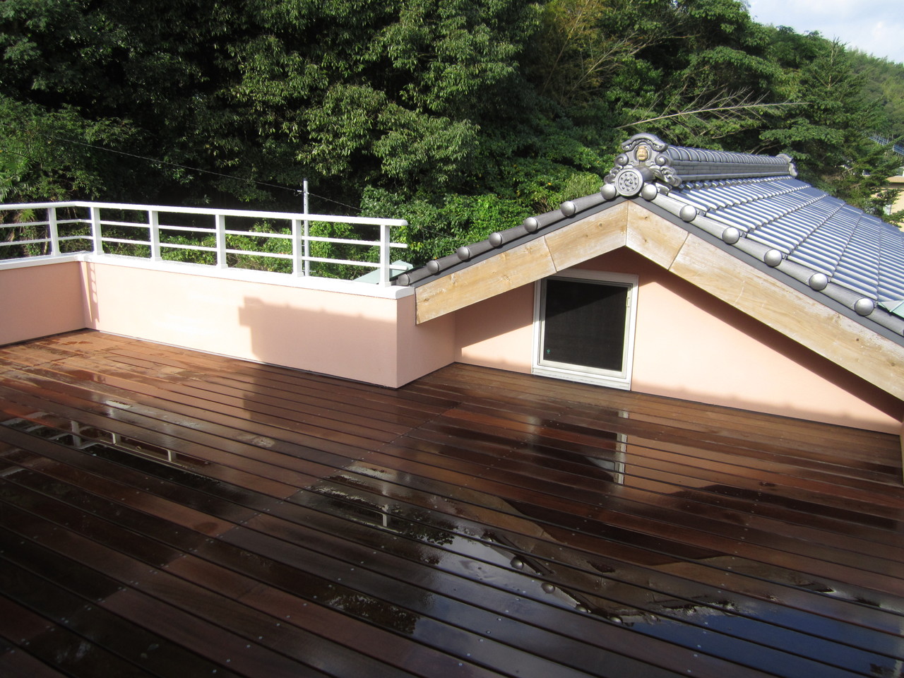 1階は床暖房付の診療室で2階は住居です。屋上に上がるとベランダがあり床はイぺ材といって固くて耐候性に優れた材料を使っています。