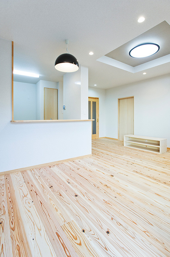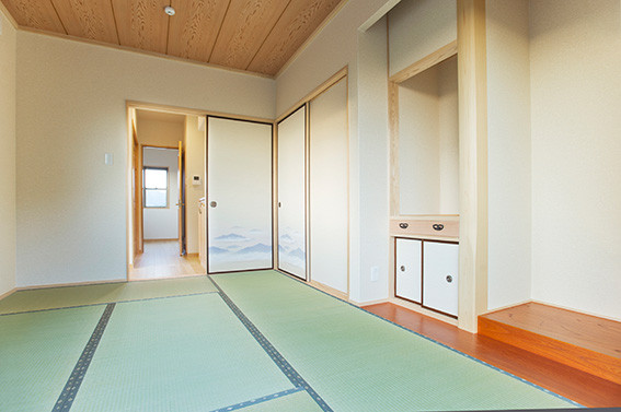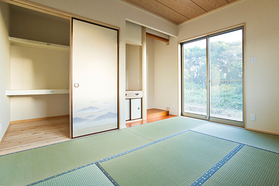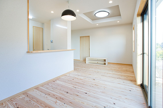 開聞岳の麓、皆さんよく御存じの唐船峡近くでのどかないい場所です。 内装は杉のうずくりフローリングで素足がきもちいい家です。冬でも木のぬくもりで快適に暮らせる住まいです。