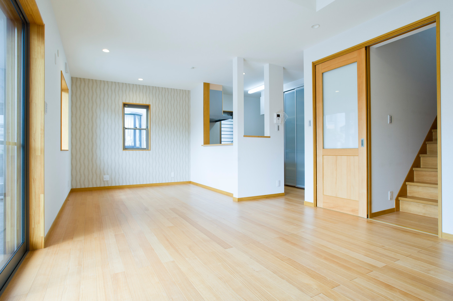 日之出町にて完成しました。こちらは、ひのきの土台、柱、梁を構造に使い柱は4.0寸柱を使用しております。床やドアなど手で触れる部分は無垢の材料にこだわり、クロスを一部珪藻土入りクロスを使いました。 玄関正面には調湿効果機能のあるエコカラットを使っています。